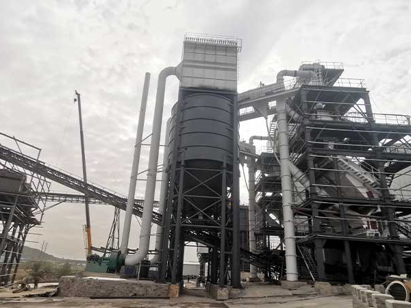 物料從原料倉經(jīng)由電子皮帶秤到帶有防塵罩的皮帶輸送機(jī)中,再由全封閉的提升機(jī)將物料入到制砂機(jī)選粉一體機(jī)中進(jìn)行破碎處理,再由高頻篩分系統(tǒng)進(jìn)行篩分處理;粉塵經(jīng)無動(dòng)力選粉機(jī)進(jìn)入到布袋收塵器,較大的粗顆粒返回到制砂機(jī)中重新進(jìn)行破碎;篩分合格的產(chǎn)品經(jīng)由加濕拌合機(jī)加水處理,防止機(jī)制砂在運(yùn)輸過程中產(chǎn)生離析以及進(jìn)一步降低粉塵的產(chǎn)生。