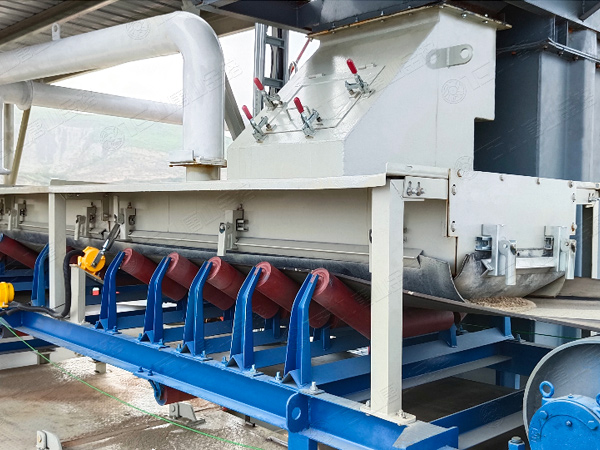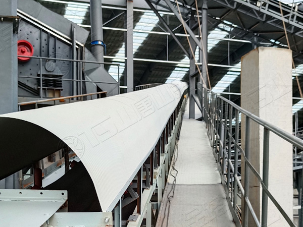 原料經(jīng)過電子秤進入到皮帶輸送機中,由全封閉的提升機將物料入到五孔碾磨制砂機內(nèi)進行破碎處理,再由空氣篩對破碎后的物料進行篩分處理,篩分后的較大物料會返回五孔碾磨制砂機中進行二次破碎,符合要求的砂子則進行裝載外運;篩分過程中的粉塵會經(jīng)粗細(xì)粉分離機進入到布袋收塵器中,而其中較大的粗顆粒會在粗細(xì)粉分離機的作用下,按需求在成品砂中進行回?fù)剑?xì)粉塵將通過風(fēng)力進入到布袋收塵器再次回收利用。